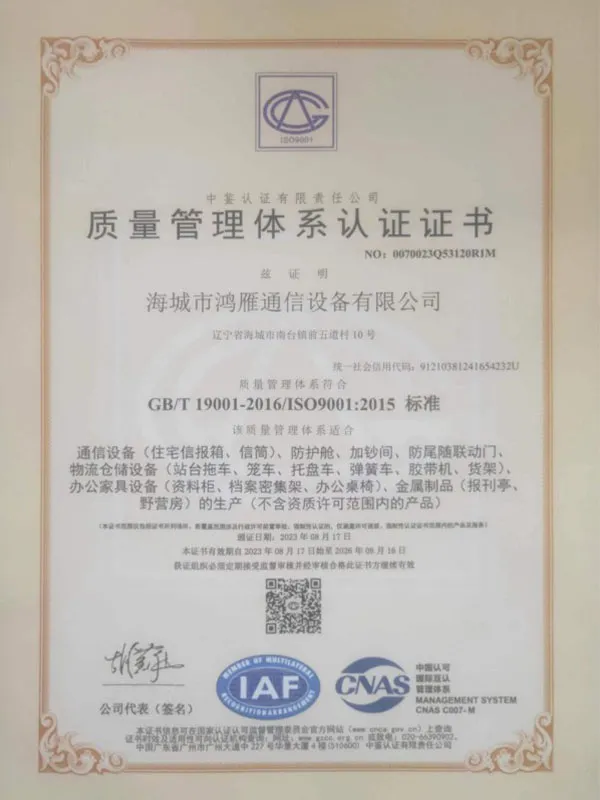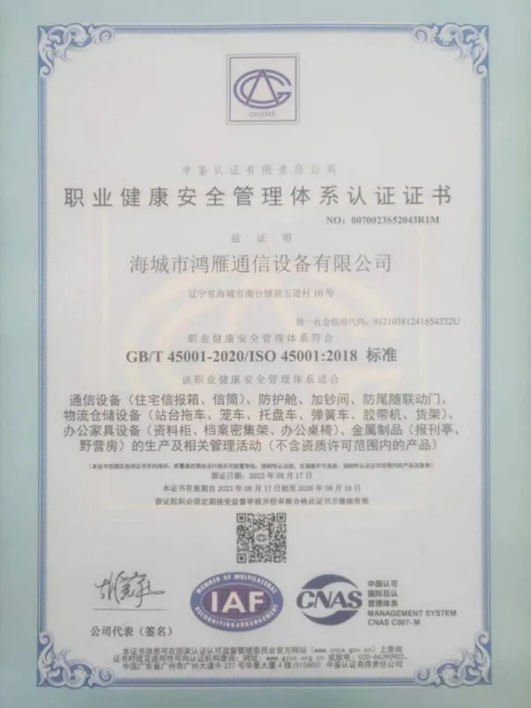 Благодаря передовым техническим преимуществам, отличным эксплуатационным характеристикам и безупречному качеству продукции компания заслужила высокую оценку пользователей, а также получила признание управляющих органов на государственном, провинциальном и городском уровнях. Изделия компании — двери хранилищ, мобильные сборные хранилища, сейфы и защитные тамбур-шлюзы — прошли проверку и сертификацию в системе органов общественной безопасности. Почтовые принадлежности и инструменты прошли испытания и сертификацию в Центре контроля качества Государственного почтового управления. По результатам проверки государственными органами управления кредитованием кредитоспособность предприятия соответствует требованиям международной системы управления кредитованием E315:9002 и применимым пунктам стандарта оценки предприятий CCA. Компания была признана учреждением категории AAA, соблюдающим качество и обязательства. Кроме того, наша компания получила сертификаты соответствия системе менеджмента качества ISO 9001 и системе экологического менеджмента ISO 14001.